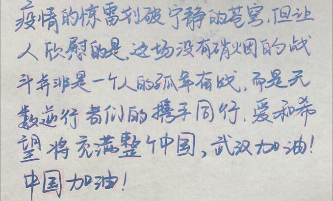 同学们以文为戈,以笔为枪,记录战“疫”中的英勇和顽强;以纸为媒,以网为介,书写共同的坚持与希望。内容各有不同,却共同表现出作为当代大学生应有的责任担当。