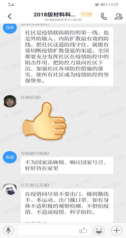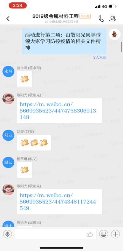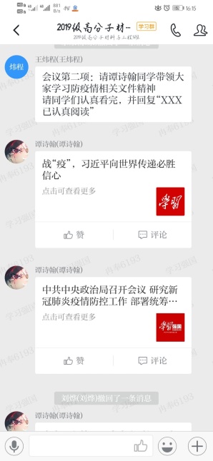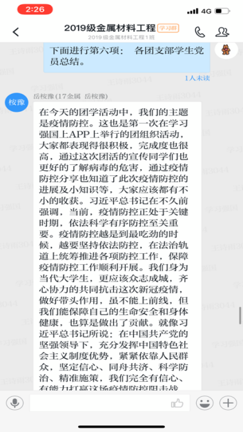 自春节以来,新型冠状肺炎疫情以强劲的势头迅速向全国蔓延,无时无刻牵动着国人的心。习近平总书记在中央政治局常委会会议上对疫情防控工作的部署讲话指出,在宣传教育和舆论引导中要做到强化显政,坚定战胜疫情信心。为积极响应党中央号召,bw必威西汉姆联官方网站党总支统筹部署,院团总支积极响应、认真策划落实,组织全院学生以班级团支部为单位于2月22日分批在学习强国平台上开展了“疫情防控系心头,材料学子在行动”主题团日活动。此次活动总体策划为六项会程。