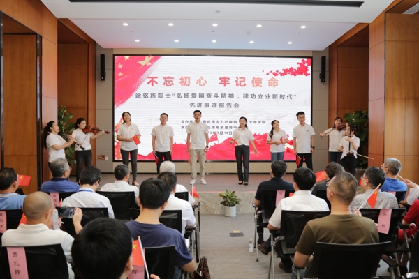 报告会还朗诵分享了涂铭旌院士生前语录《用我寸草心 报得三春晖》及涂铭旌的同事学生对其哀思。我校师生现场演唱《我和我的祖国》,以此来缅怀涂老,展现青年人报效祖国、报效家乡的昂扬斗志。