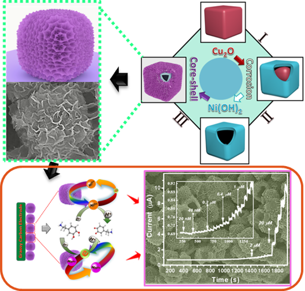 团队从动力学角度出发,提出不同维度纳米功能材料的结合可以进一步改善电催化动力学的观点,首次将3D Ni(OH)2纳米箱与2D MnO2 纳米片耦合,运用到多巴胺电化学传感器中。实验结果表明,Ni(OH)2@MnO2电极对多巴胺具有极低的检测限(1.5nM,其扩散系数和催化效率常数达2.43×10-6 cm2 s-11.7×103 M-1 s-1。具有3D@2D结构电催化剂的开发不仅仅局限于电化学传感器领域,在电分析、电储能等领域都有潜在的应用价值。